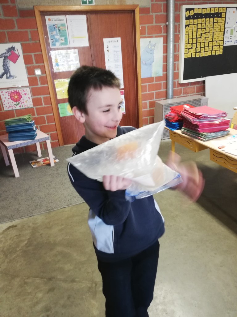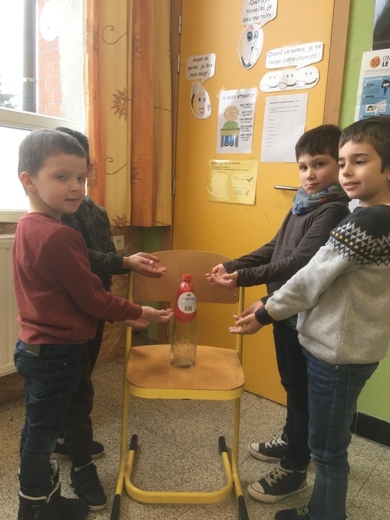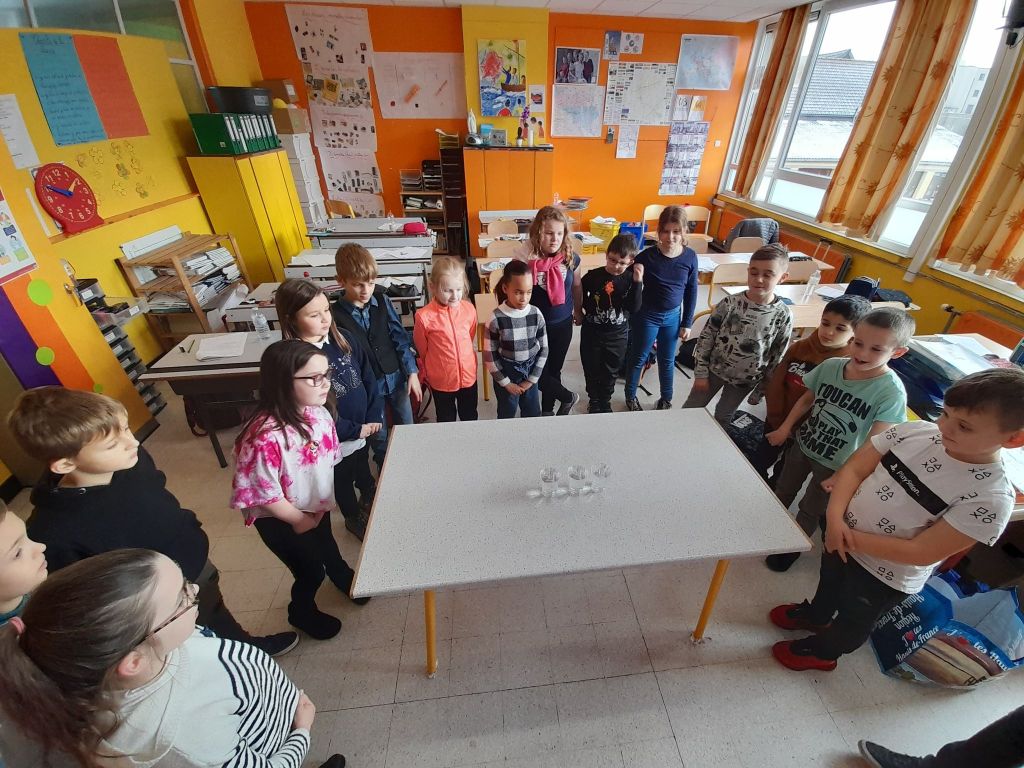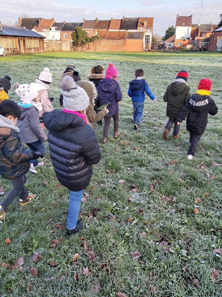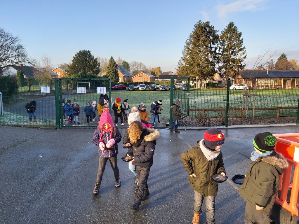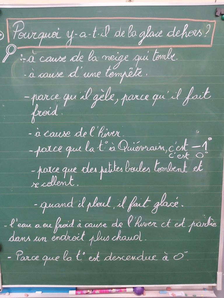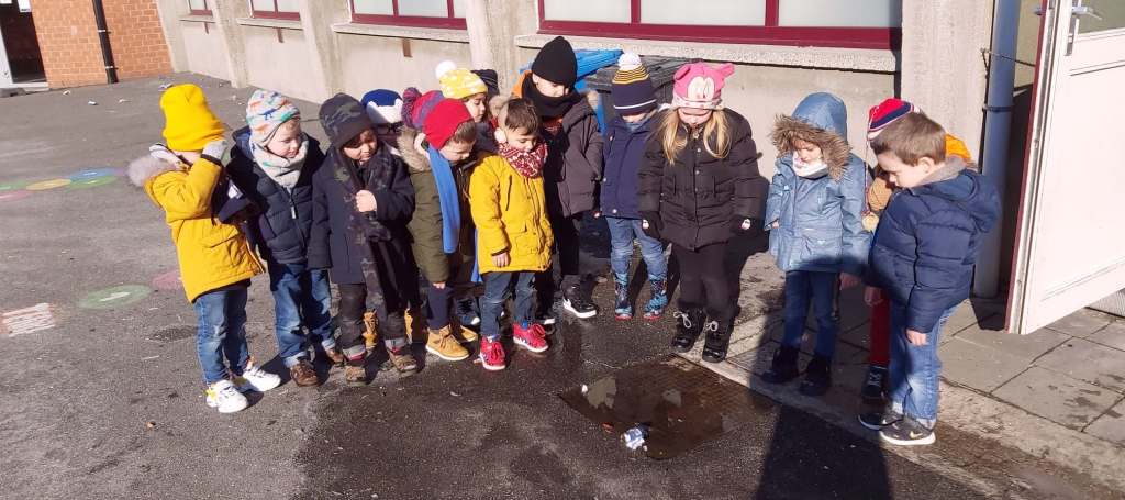 Suite à la première avancée hivernale de l’année, les enfants ont constaté que l’eau présente dans la flaque devant la classe avait disparu pour laisser place à de la glace, une glace présente partout dehors, dans la plaine, sur les voitures…