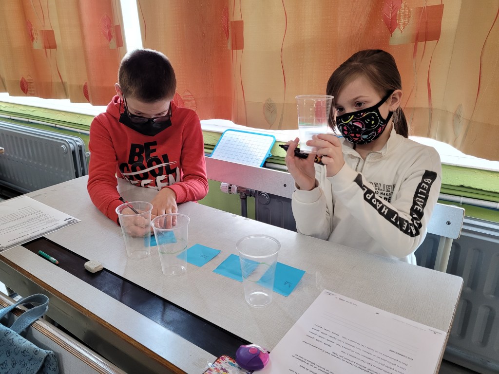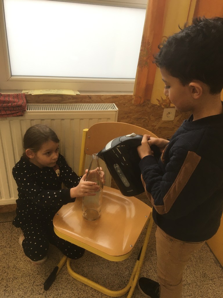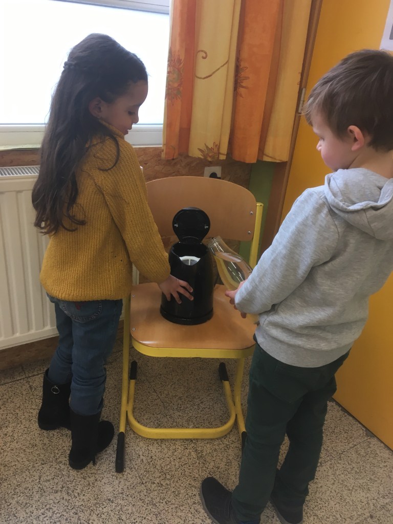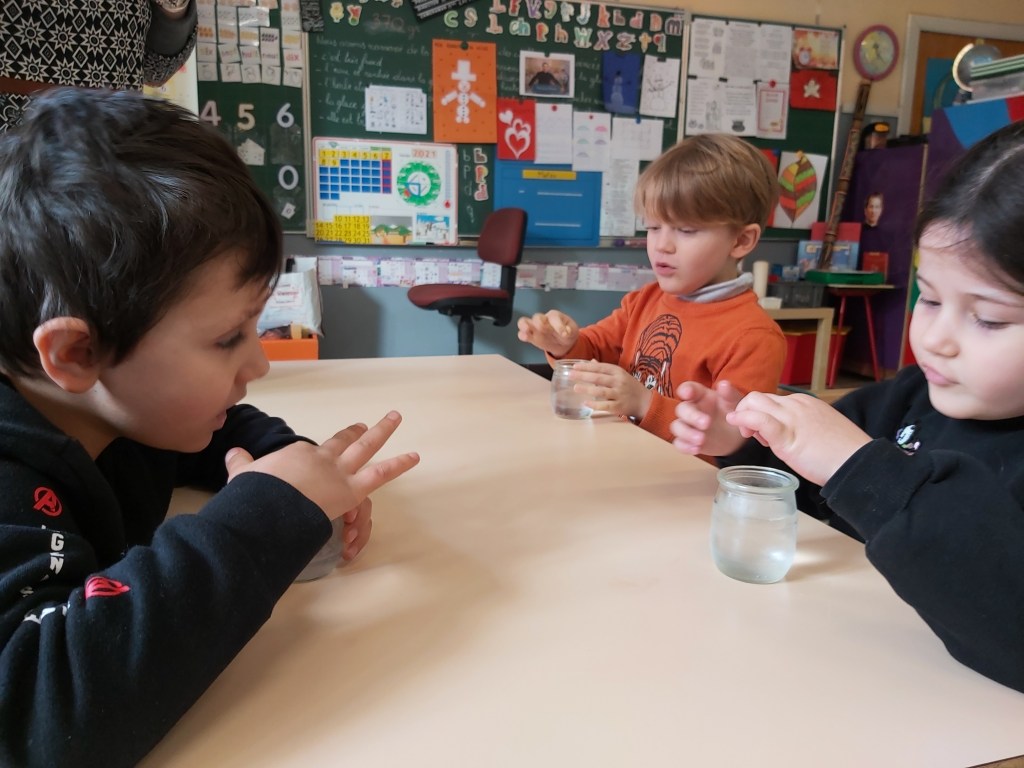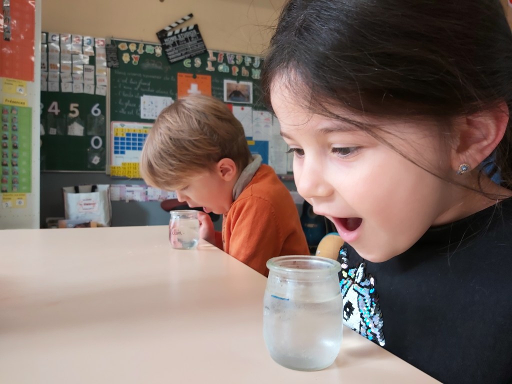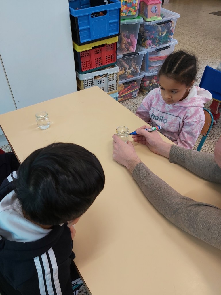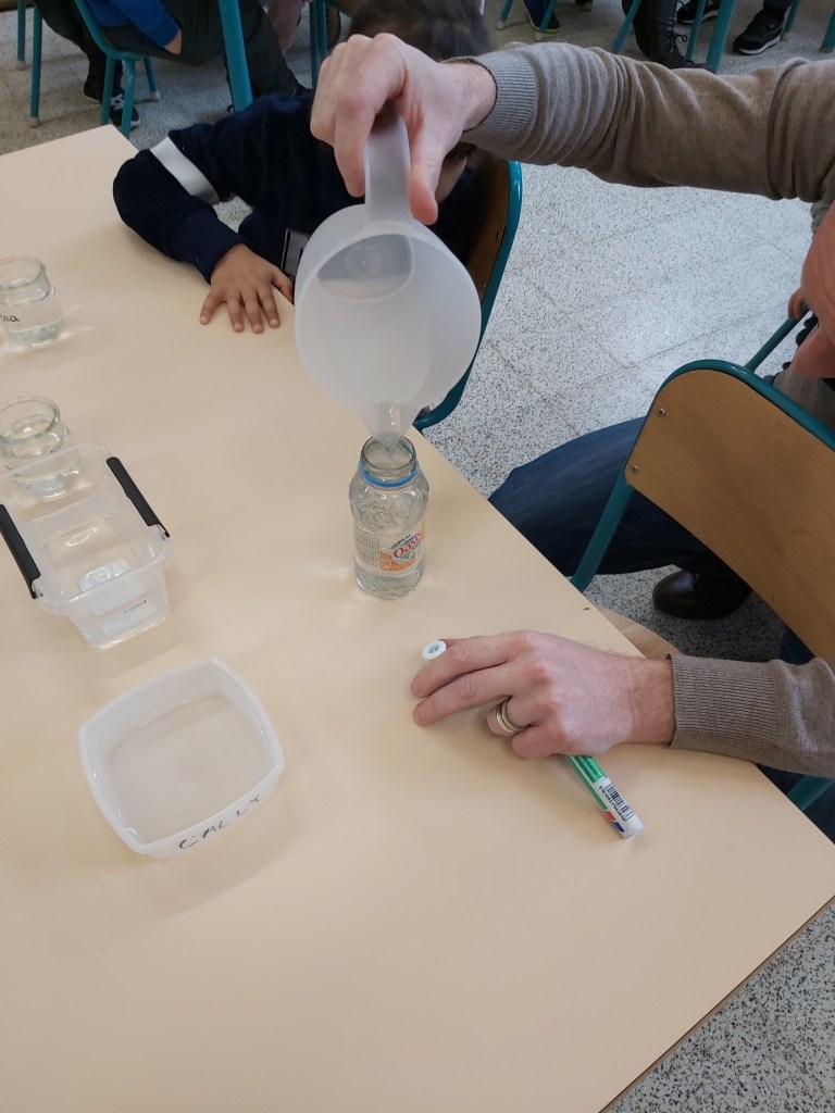 - Chaque enfant remplit un pot d’eau sur lequel on trace le niveau de l’eau.