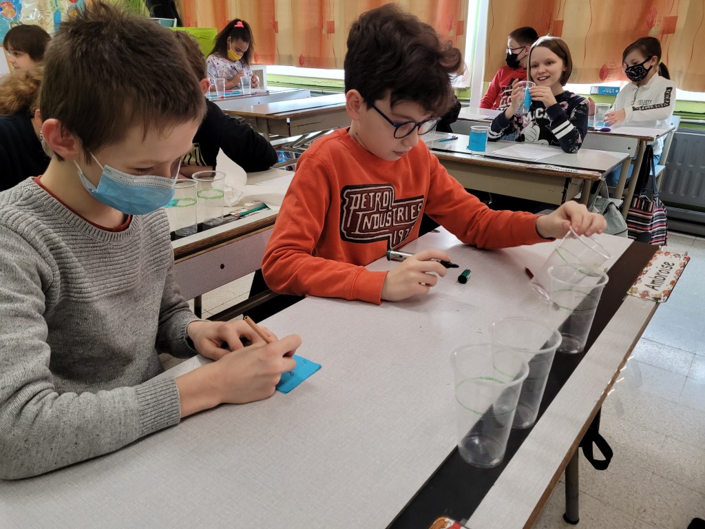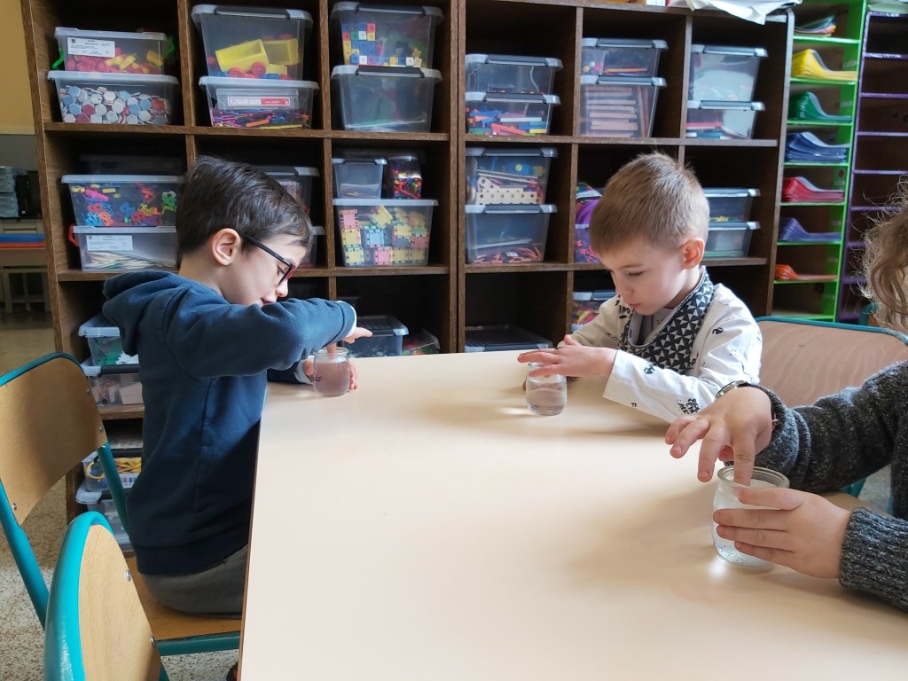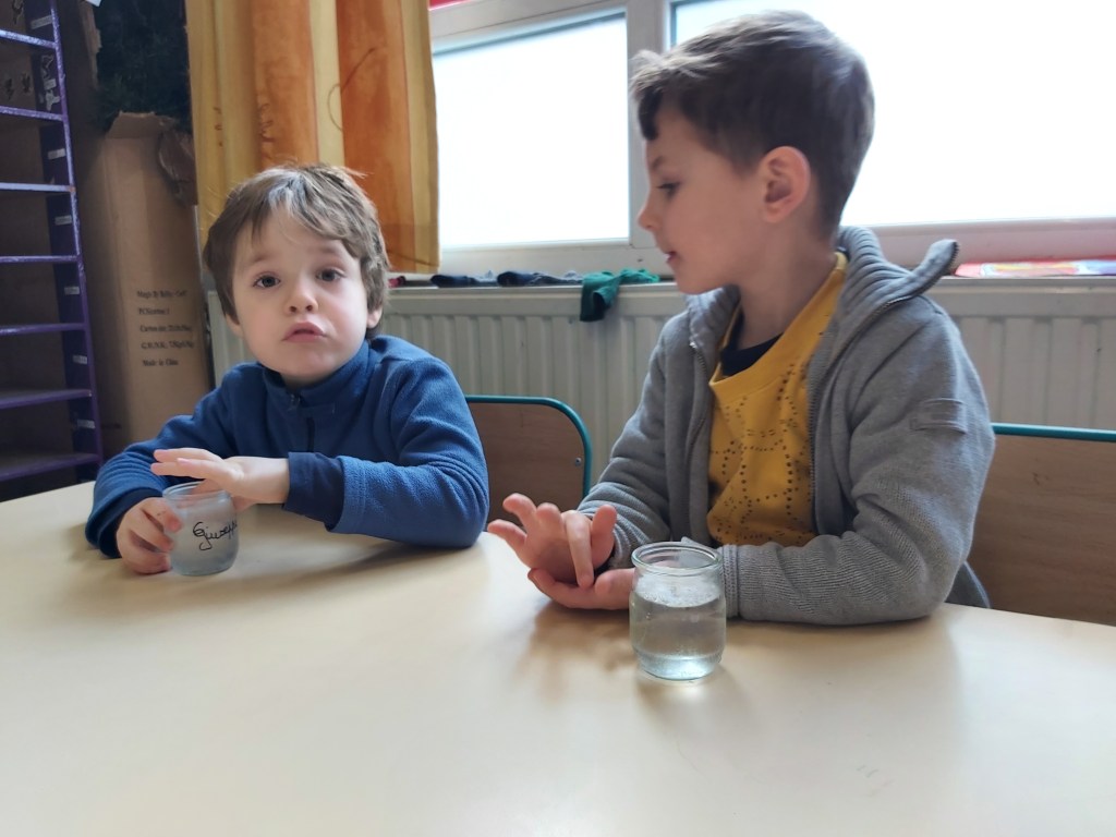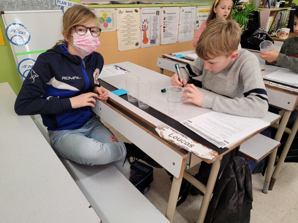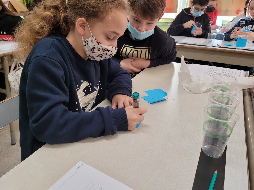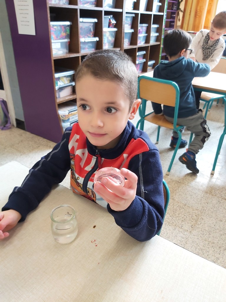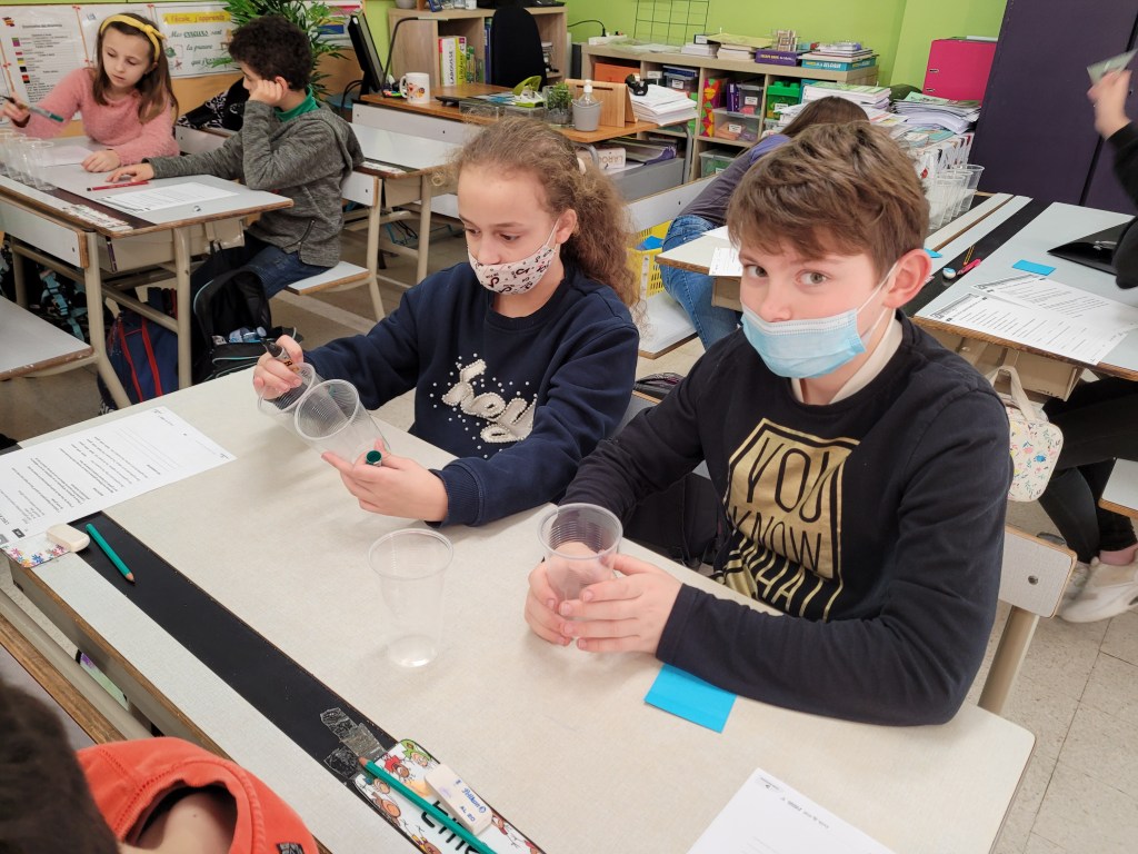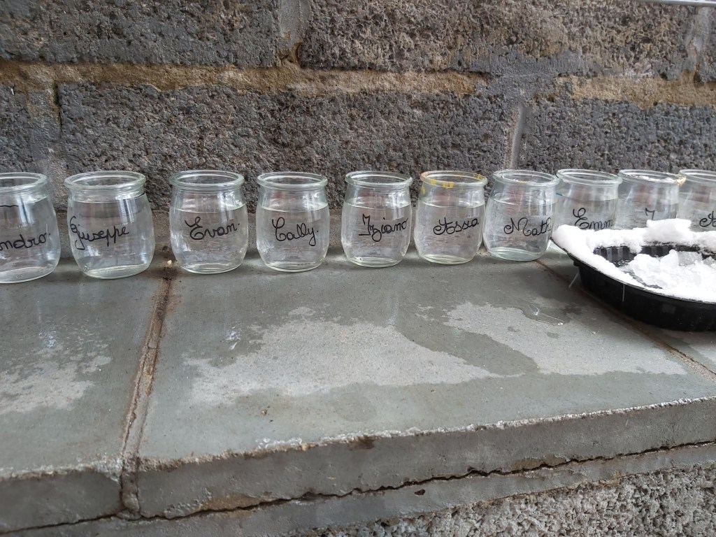 - Chaque enfant remplit un pot d’eau sur lequel on trace le niveau de l’eau.