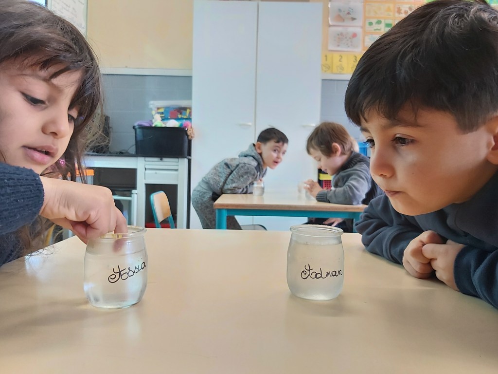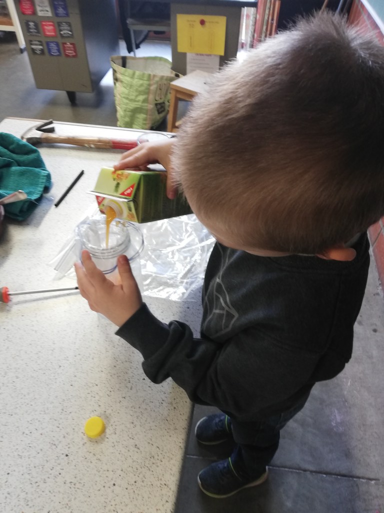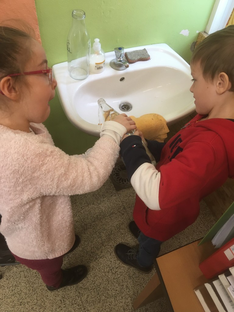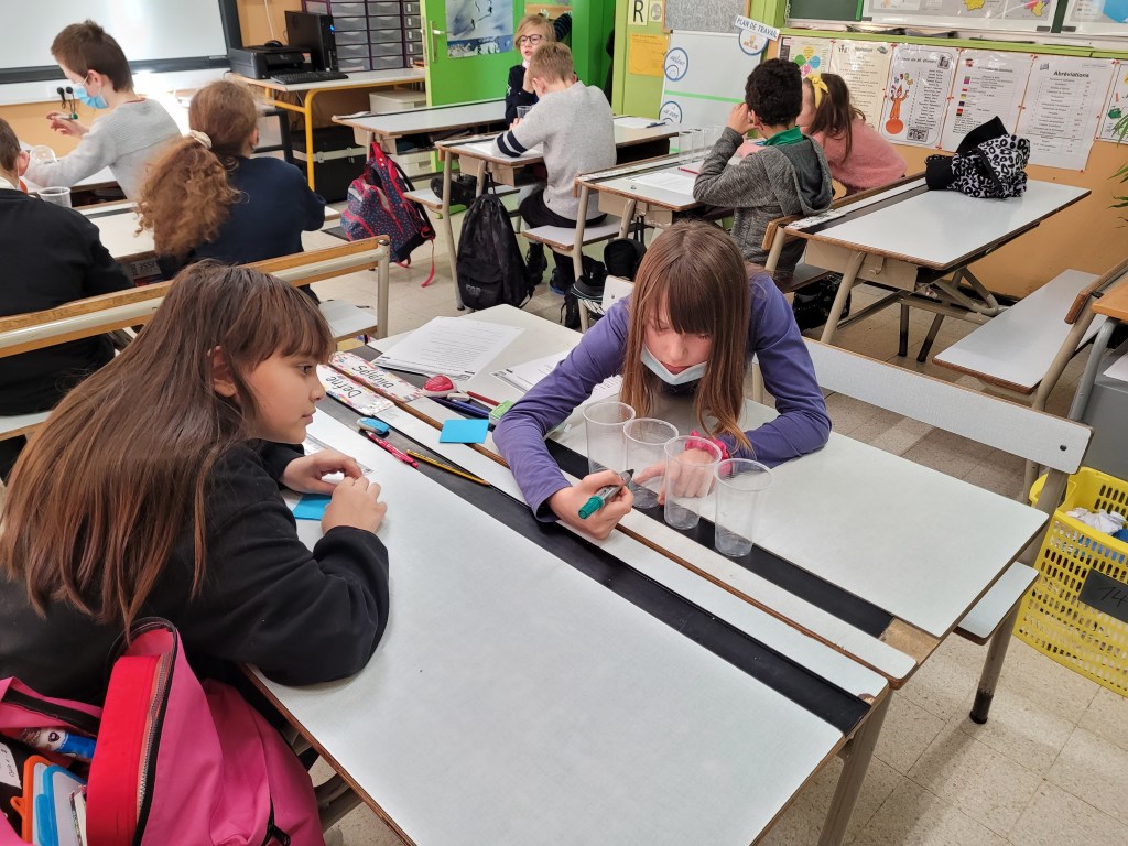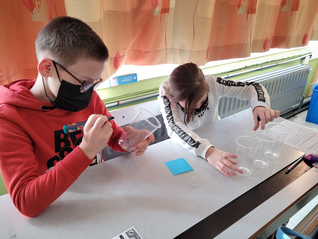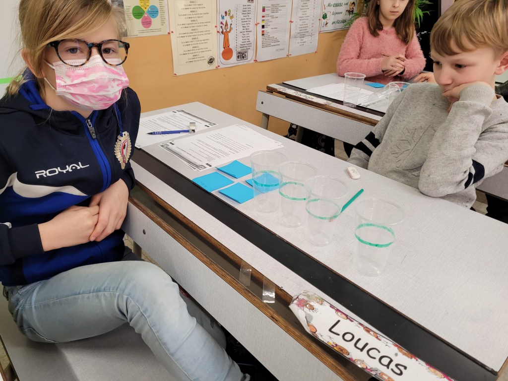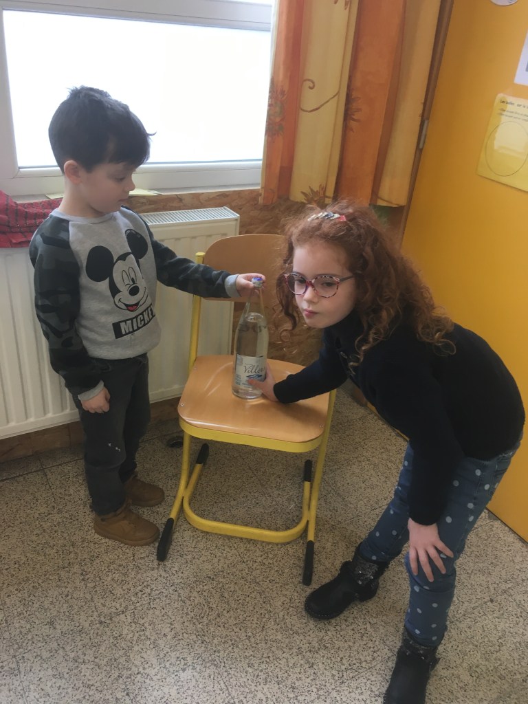 - Chaque enfant remplit un pot d’eau sur lequel on trace le niveau de l’eau.
