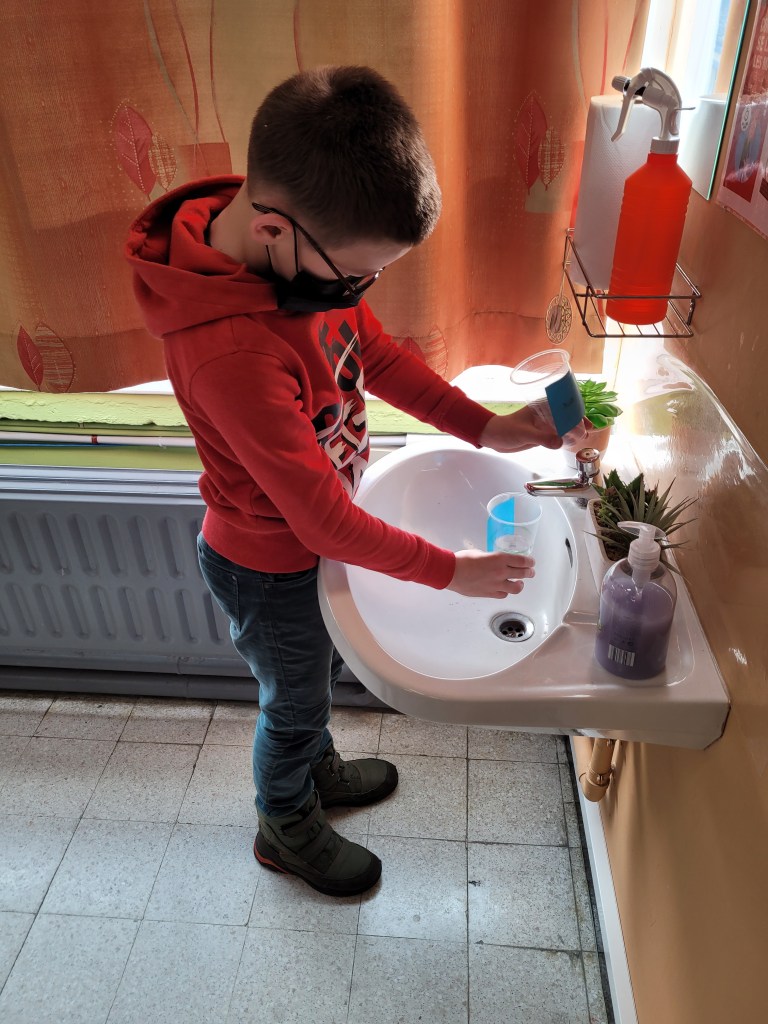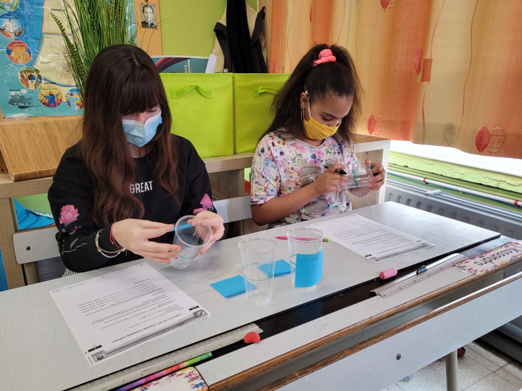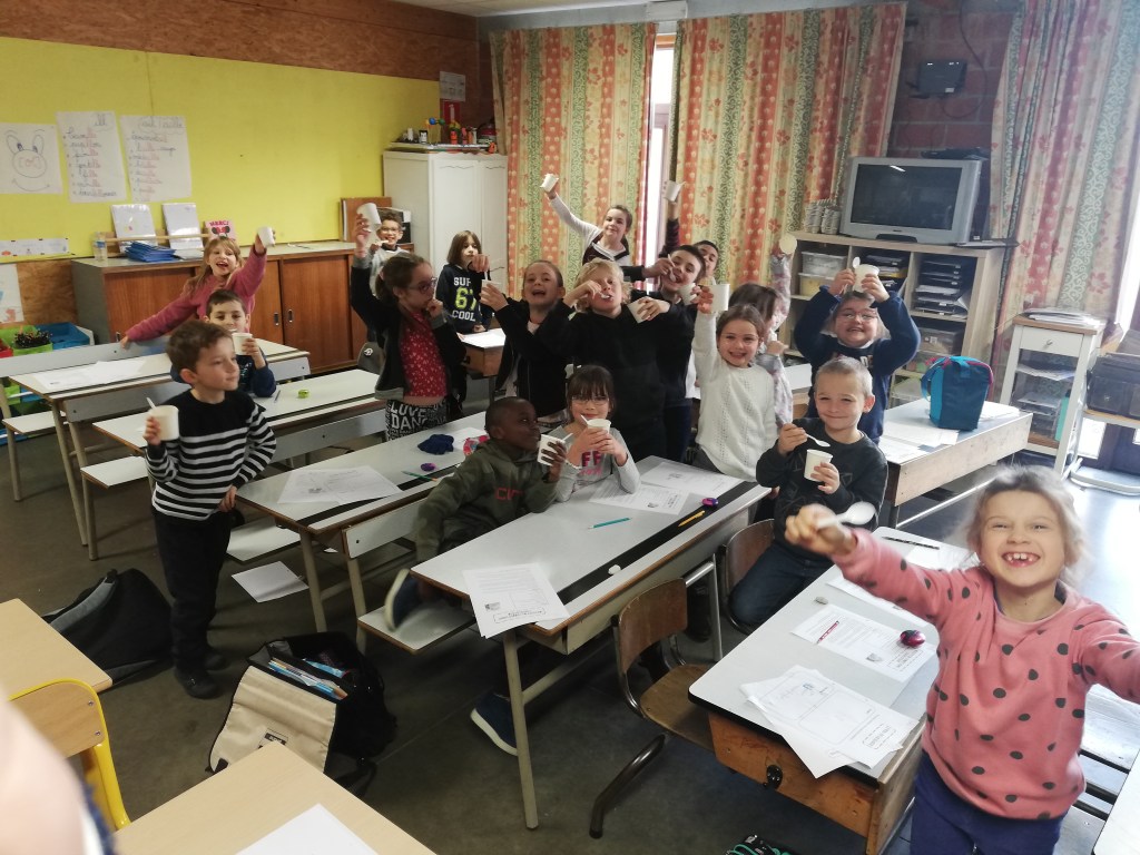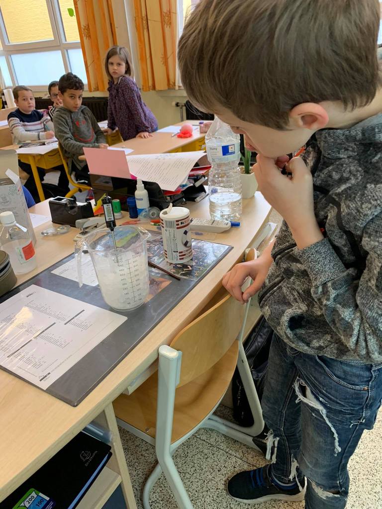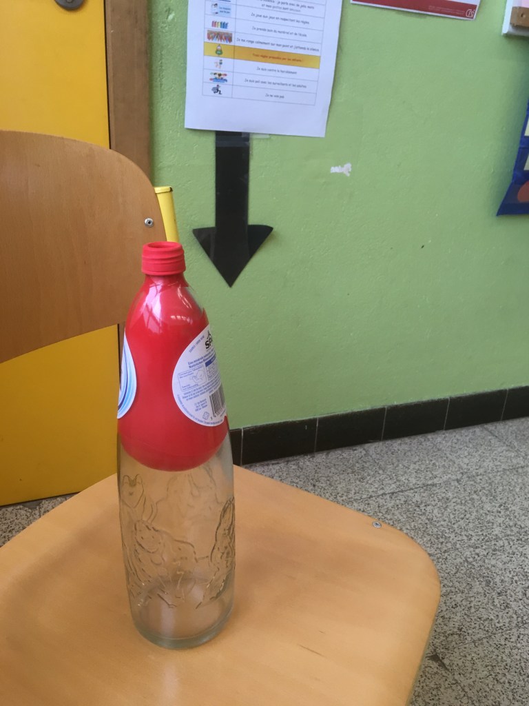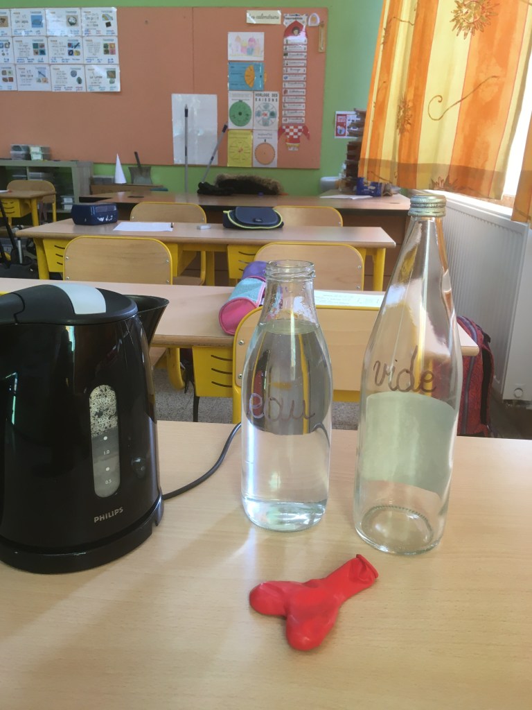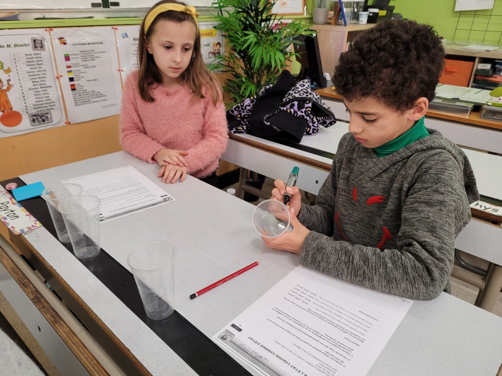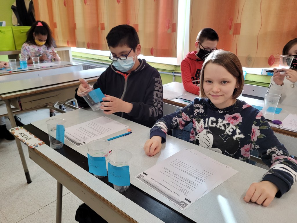 - Chaque enfant remplit un pot d’eau sur lequel on trace le niveau de l’eau.