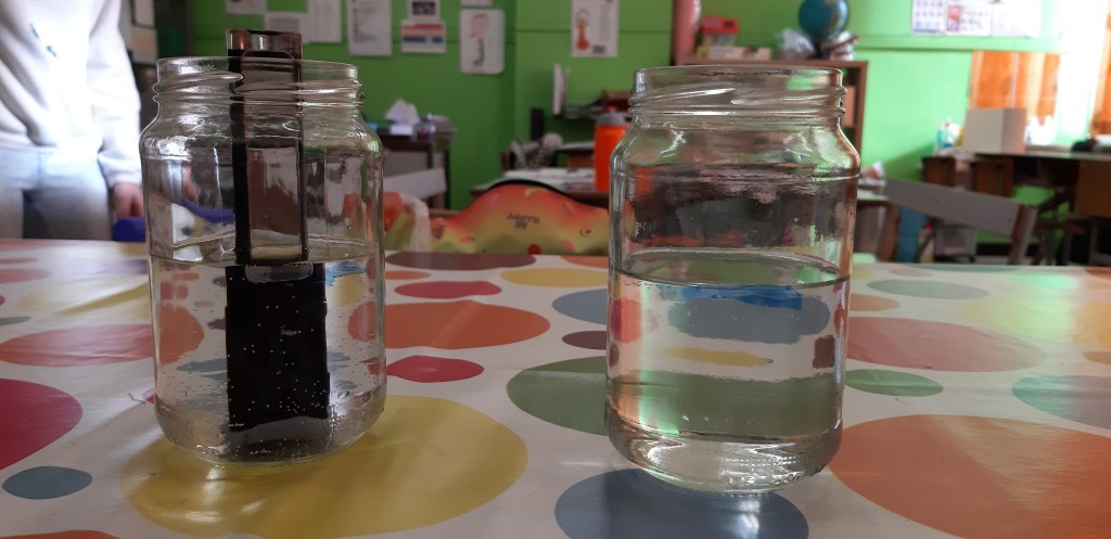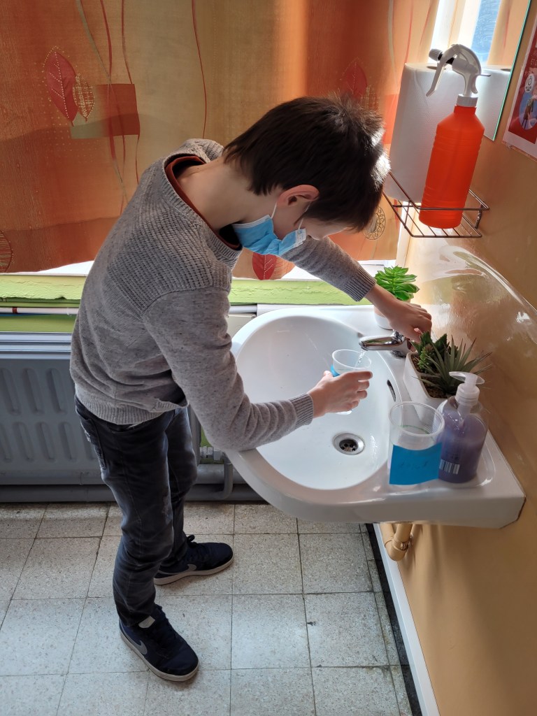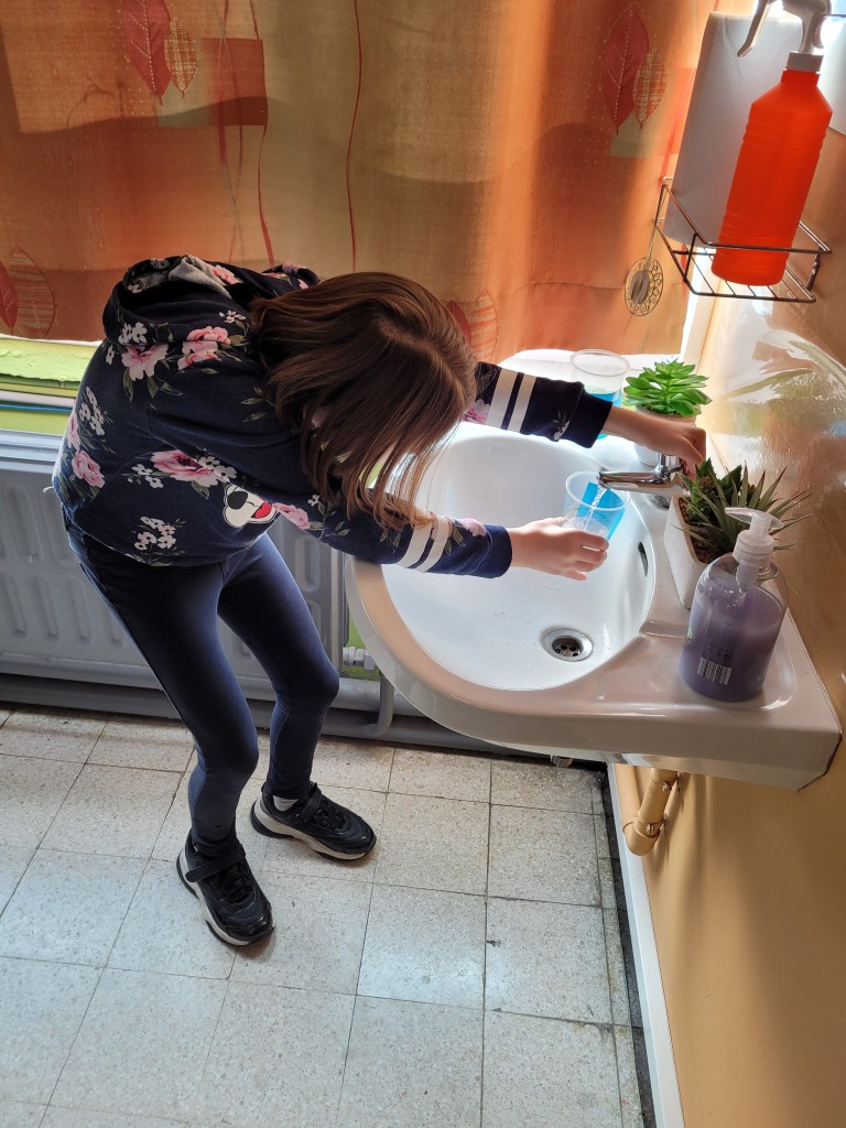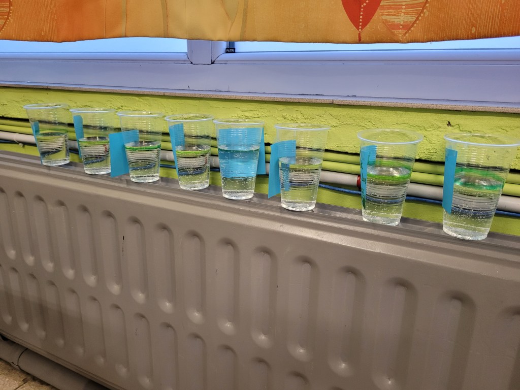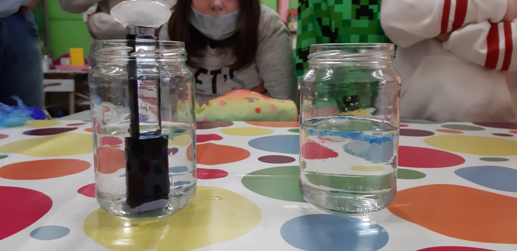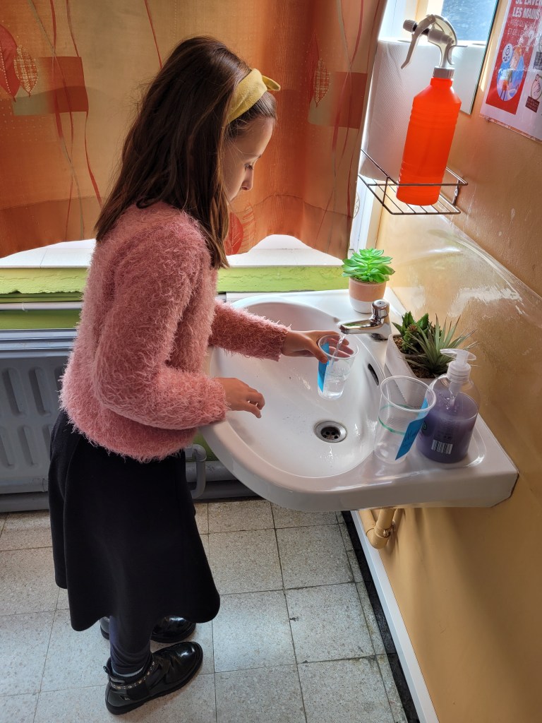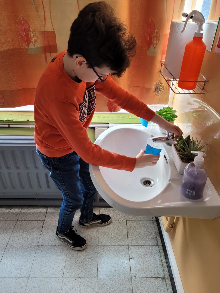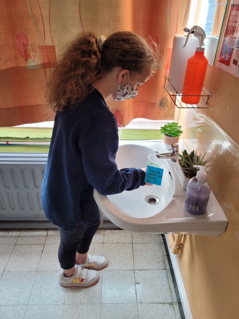 - Chaque enfant remplit un pot d’eau sur lequel on trace le niveau de l’eau.