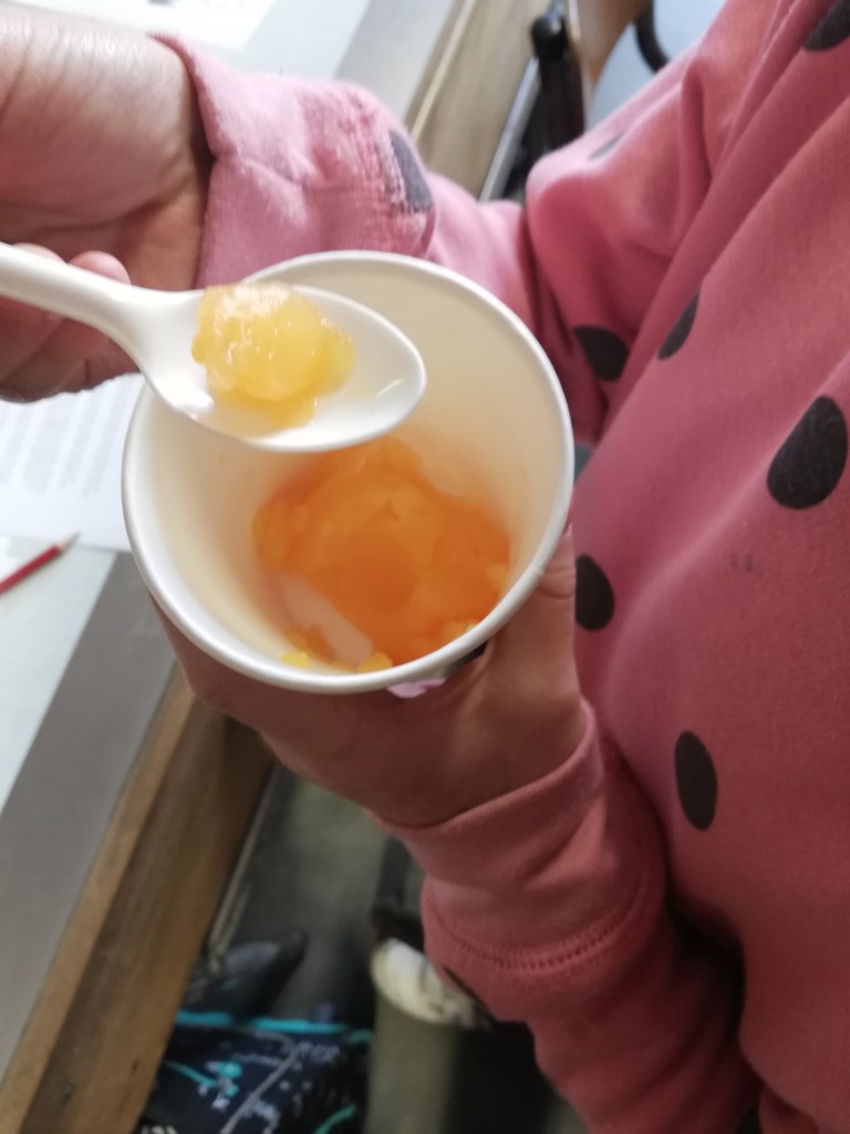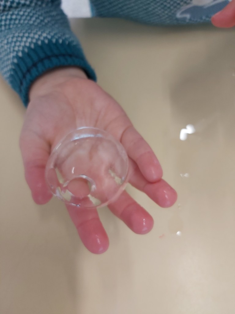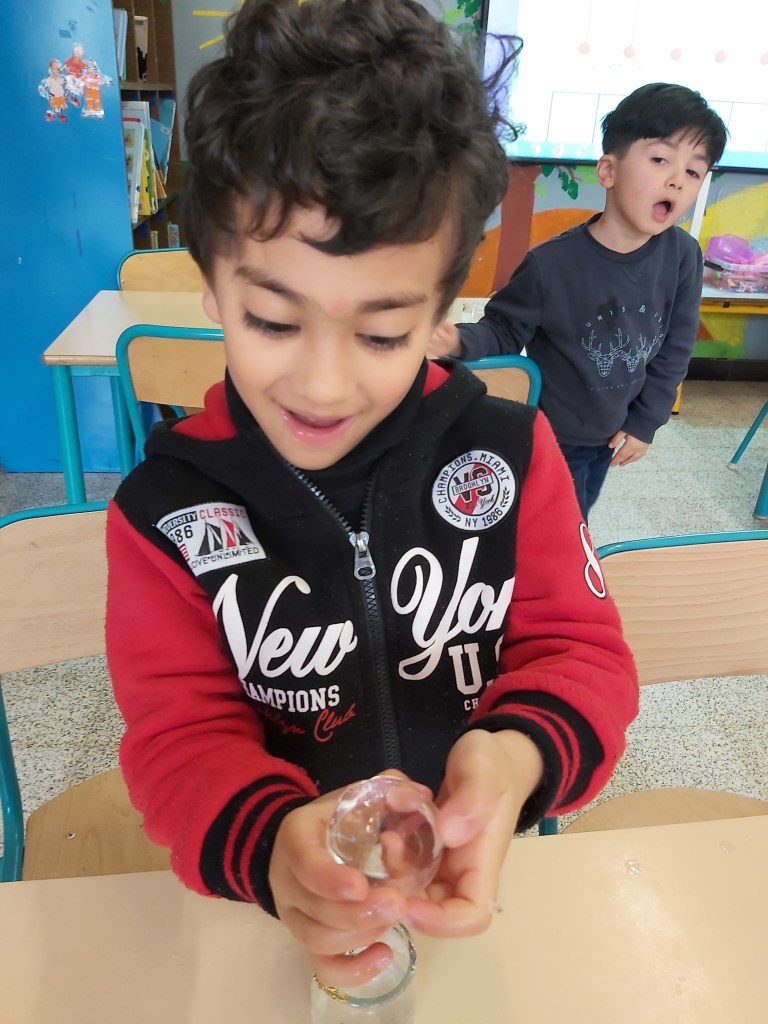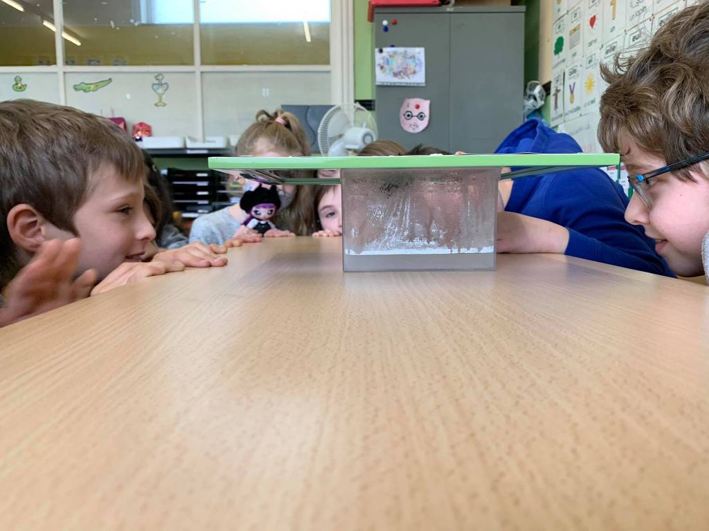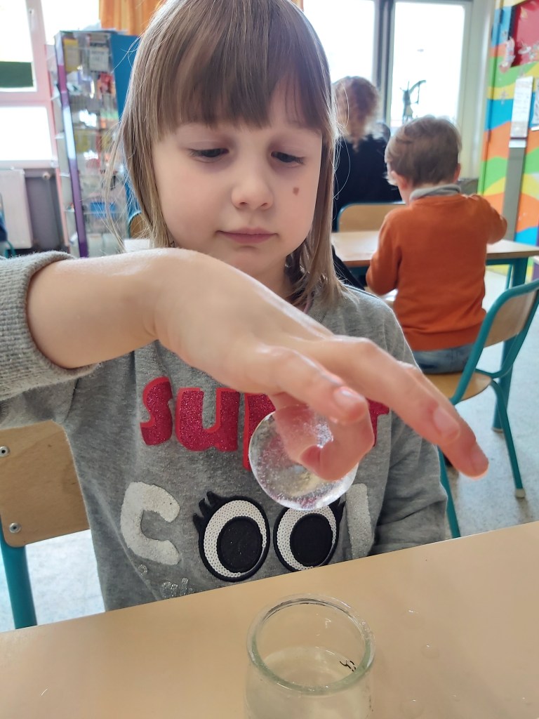 - Les enfants constatent des bulles qui ne bougent pas dans la glace ce qui nous permet de leur expliquer qu’il y a de l’air emprisonné dans la glace.