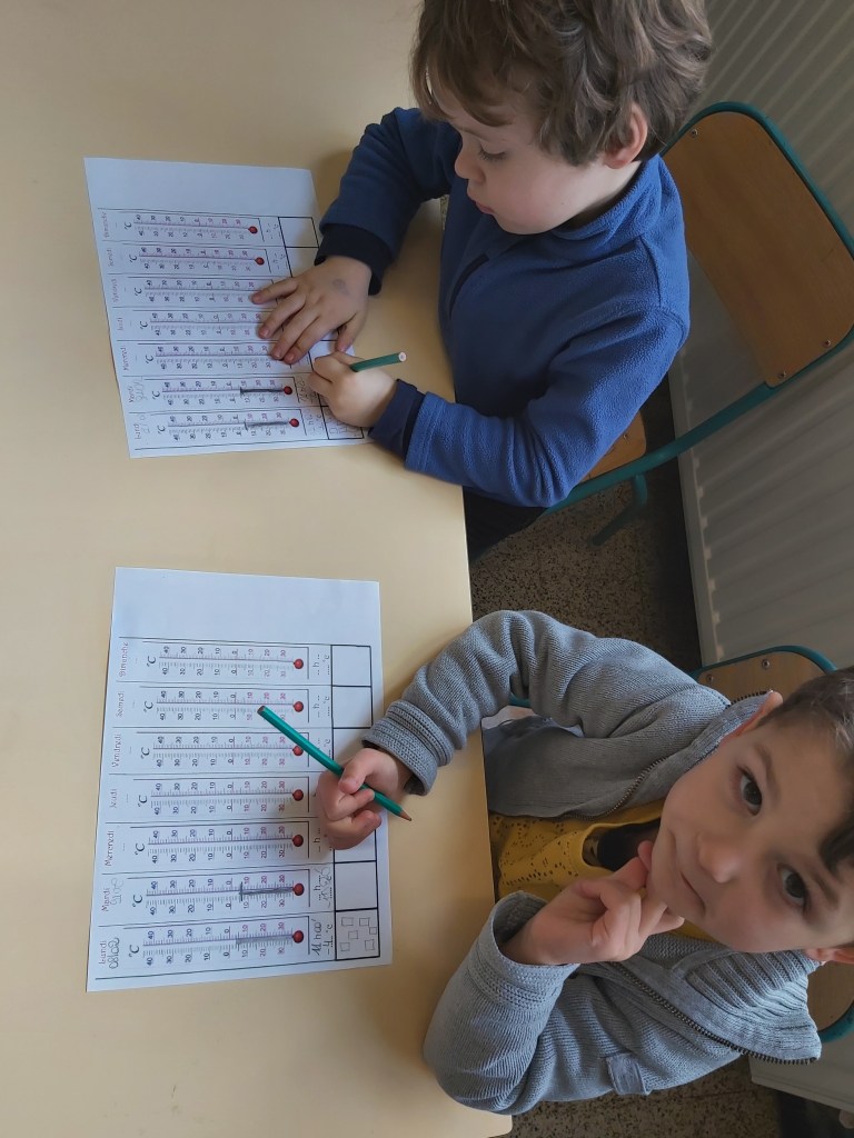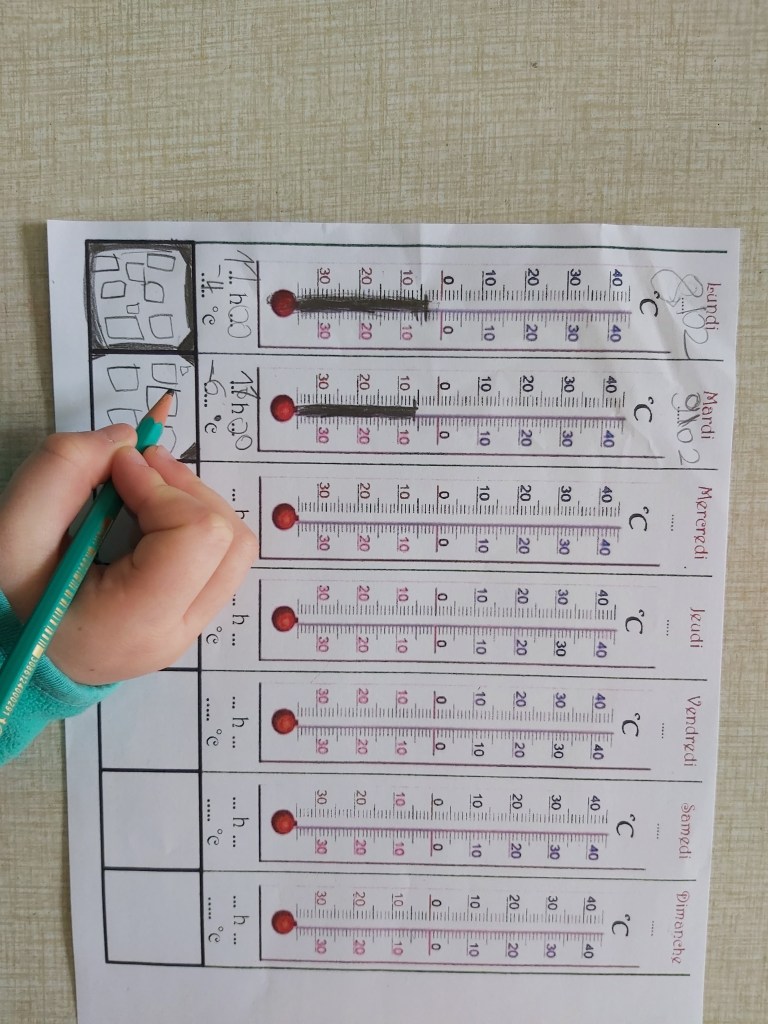 - Suite à l’hypothèse de la température négative proposée par un enfant, nous décidons de mettre un thermomètre dehors afin de relever les températures chaque jour pour pouvoir en tirer des conclusions.