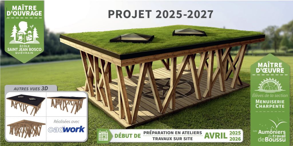 - Création du pavillon au Vert Bocage (visuel ci-dessous). Un espace pour travailler, pour s’abriter, pour jouer, pour discuter… La pédagogie de l’Ecole du dehors aura bientôt un bel atout pour se développer : animaux, potager, fleurs. C’est tout un écosystème qui viendra s’y greffer dans les prochains mois et prochaines années.